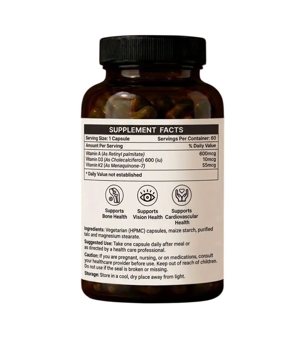 Vitamin A (As Retinyl palmitate)†,Vitamin D3 (As Cholecalciferol) 600 (iu)†,Vitamin K2 (As Menaquinone-7).